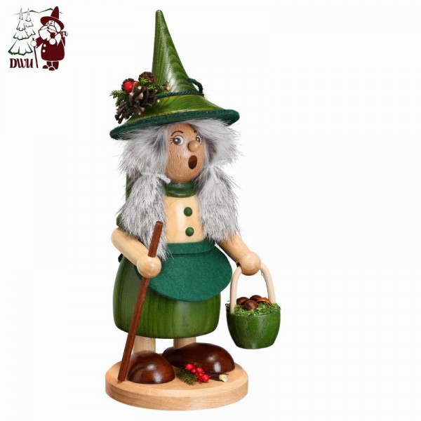 Produktinformationen "Erzgebirgische Räucherfigur Wichtelfrau mit Pilzkorb grün Drechselwerkstatt Uhlig"